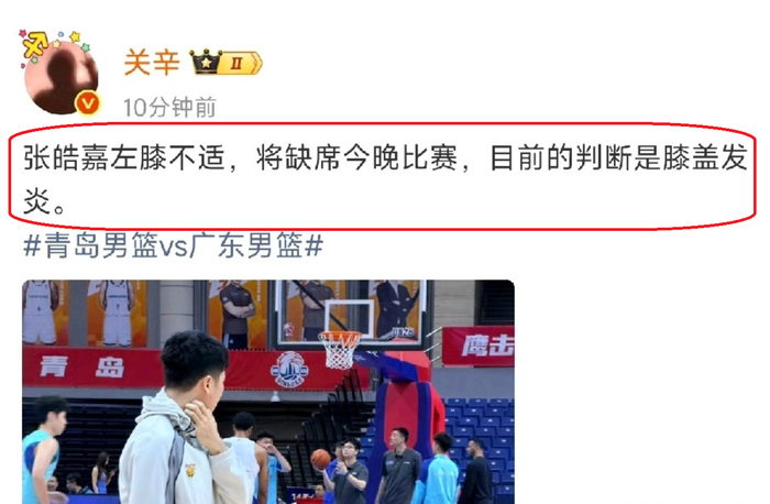 根据广东队随队记者关辛表示,张浩嘉因为左膝受伤,将会无缘与青岛队的比赛,根据了解,张浩嘉的膝盖出现了发炎,而且,还是比较严重。在赛前,张浩嘉也是没有参加训练,只是来到场边,给队友捡球。